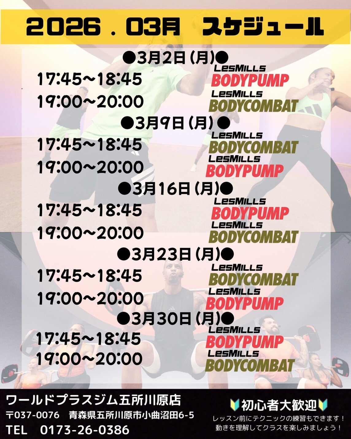 対面レズミルズレッスン3月スケジュール【BODYCOMBAT/PUMP】