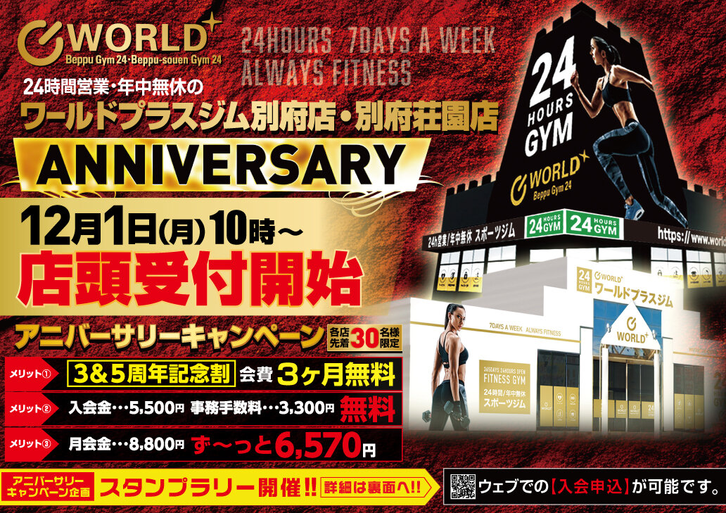 ワールドプラスジム別府荘園店 ANNIVERSARYキャンペーン(12/1 10:00〜店頭受付開始)