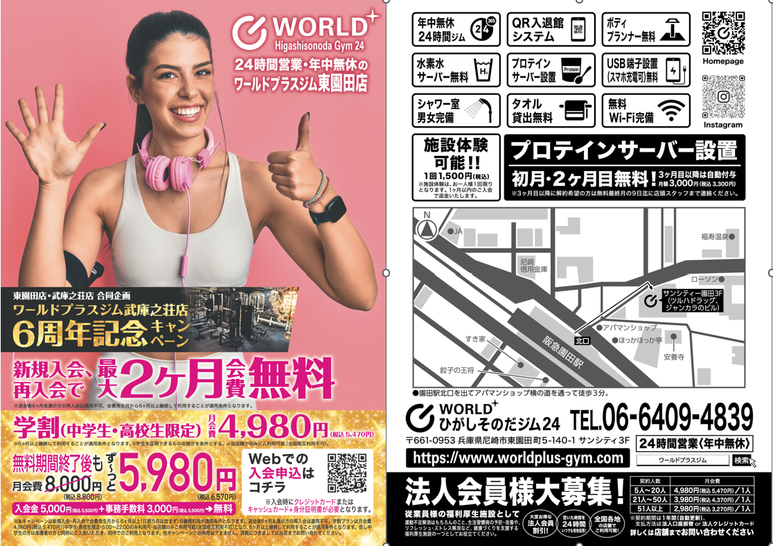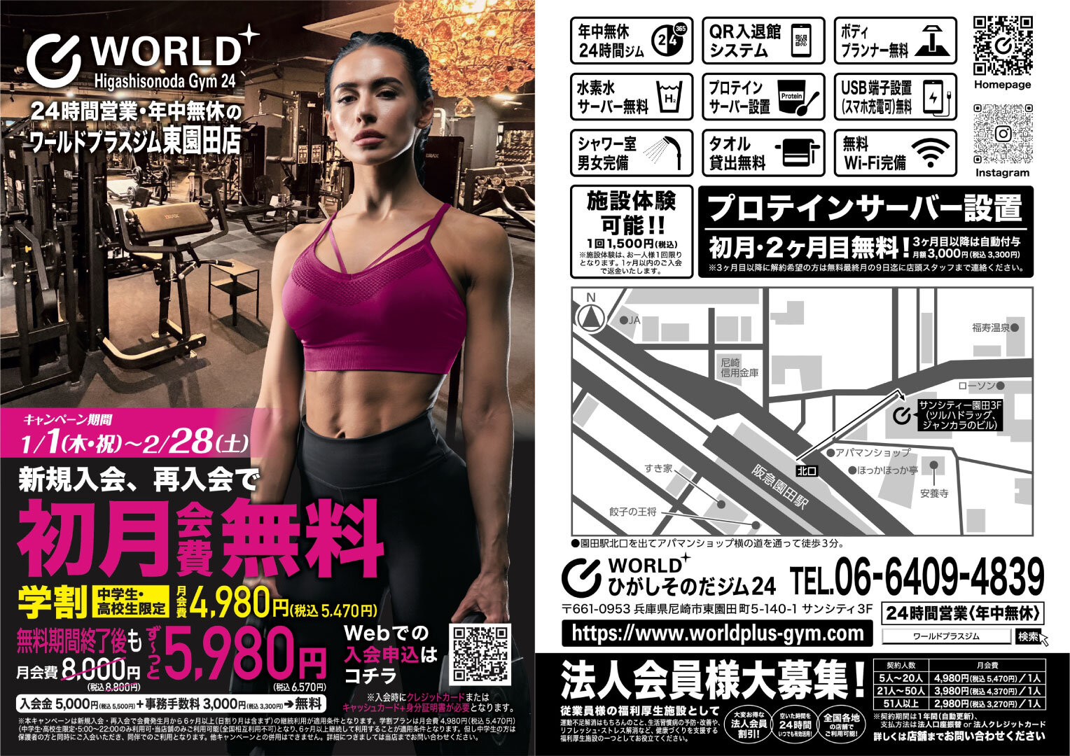 ワールドプラスジムは美ボディメイク・健康的な身体作りをお手伝いします!ご入会は公式HP「ワールドプラスジム東園田店【検索】」または店頭受付までどうぞ。