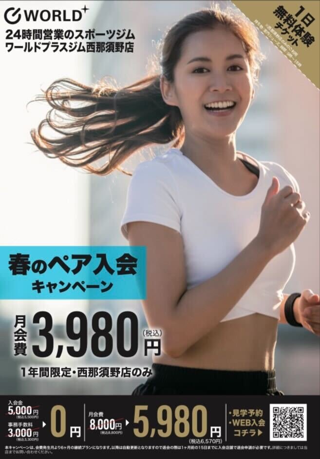 ペア入会プラン 3,980円(税込) 1年間限定・西那須野店限定