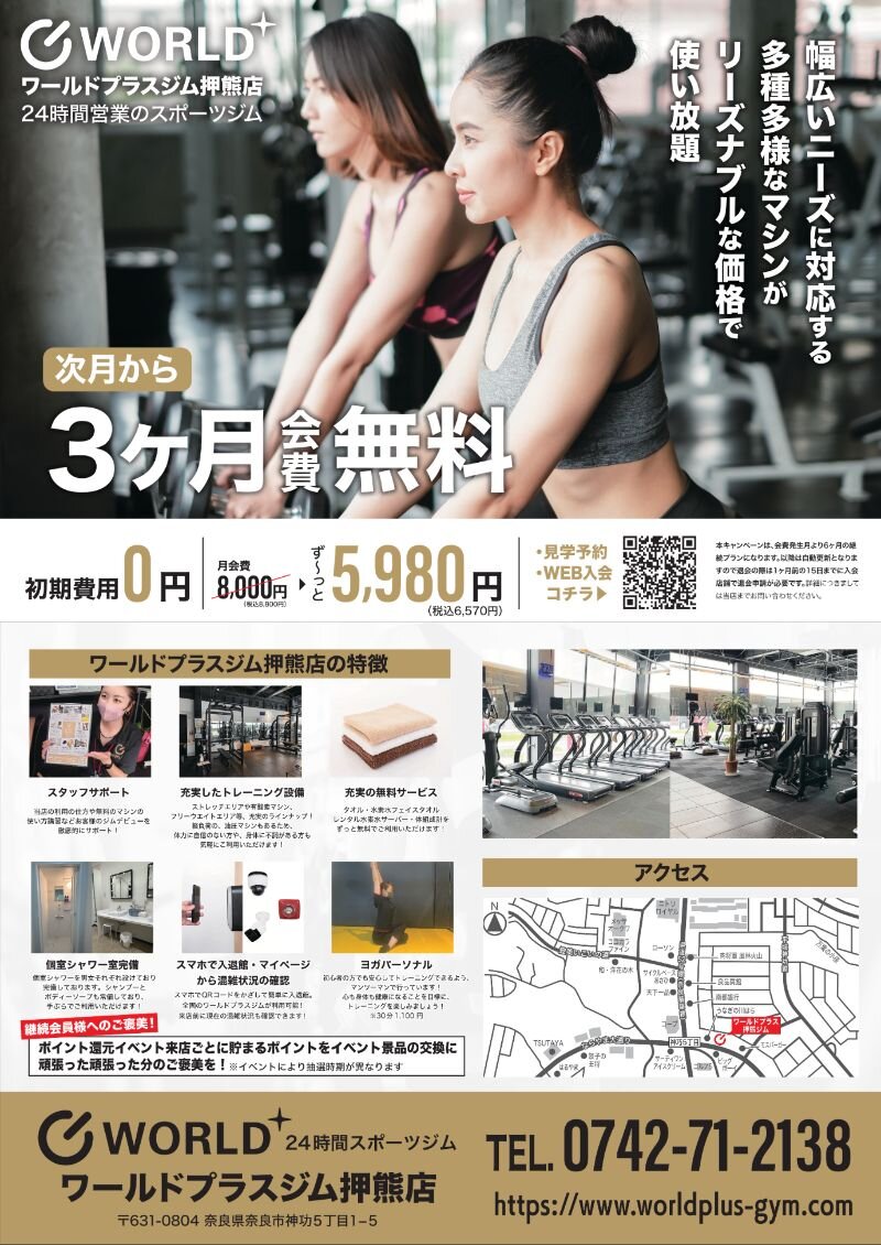 ご入会はWebからも出来ますが、スタッフと一緒に手続きされたい方は、ワールドプラスジム押熊店へお越しください。