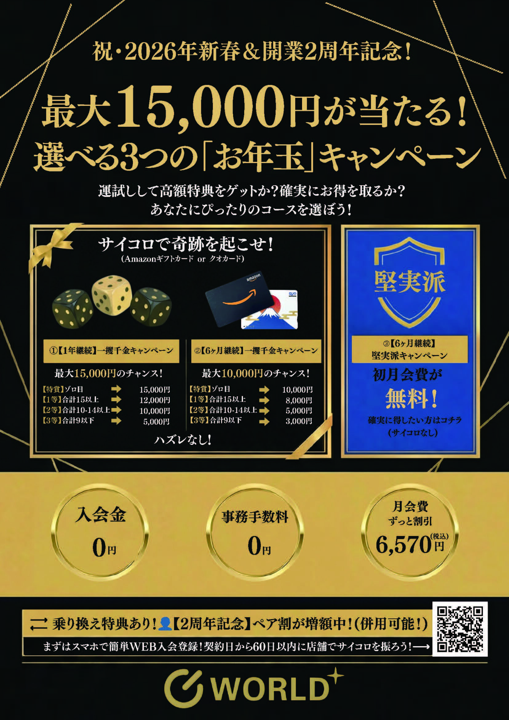 5,980円(税込6,570円) **入会後、契約日から60日以内に店舗へお越しください!** 店頭でサイコロを3つ振って、出た目に応じてAmazonギフトカードまたはQUOカードをその場でプレゼント! 最大10,000円のチャンス!(最低でも3,000円保証) まずは半年、しっかり頑張りたい方はこちら! 特賞(ゾロ目):10,000円 |