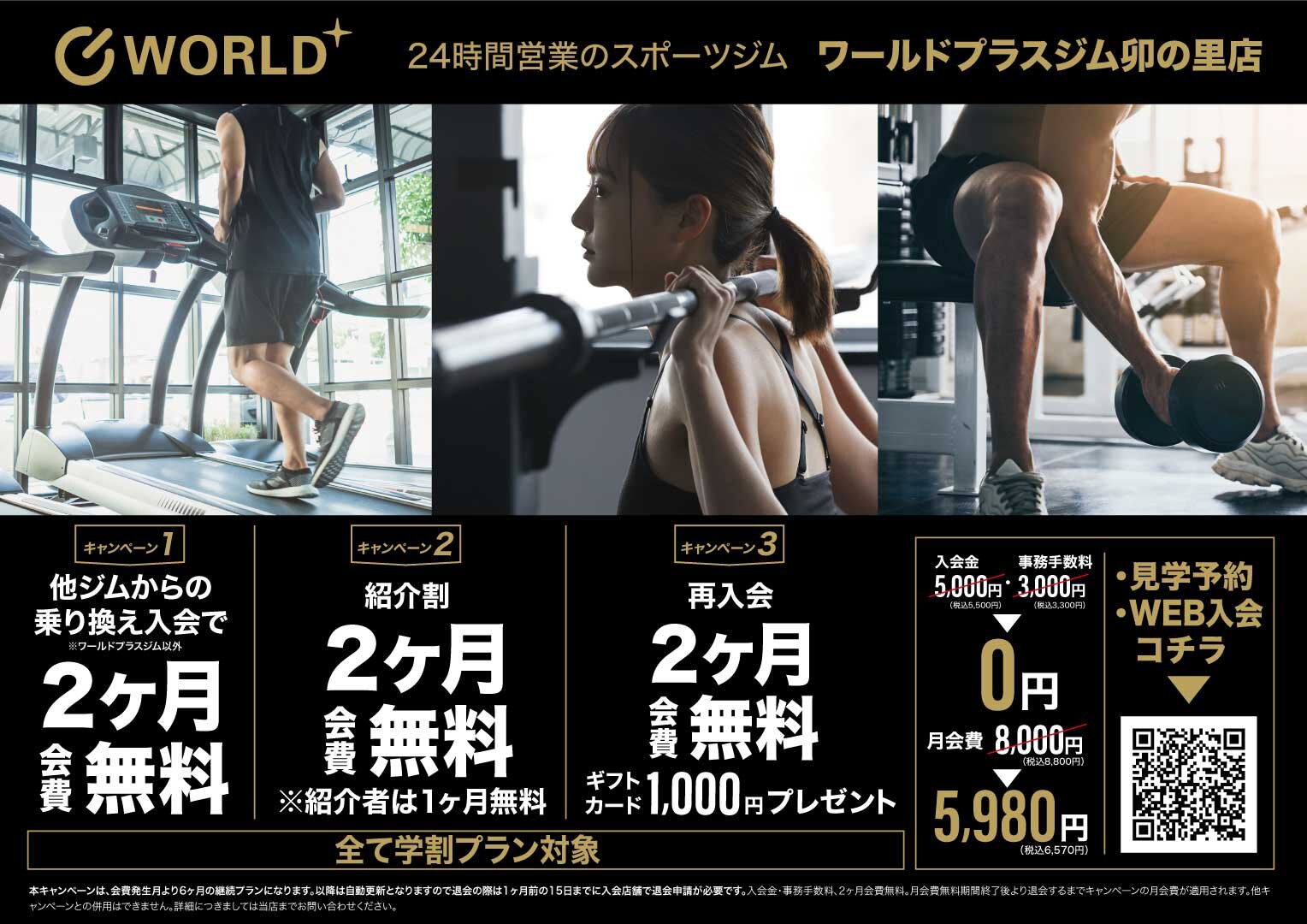 【他ジムからの乗り換え限定】2ヶ月無料プラン ※ワールドプラスジムからの乗り換えは不可